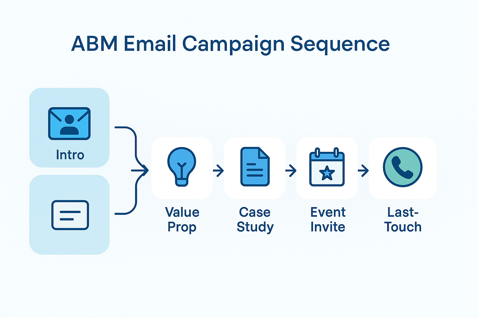 A strong ABM campaign sequence includes five touches: intro, value, proof, content invite, and a final check-in. Space these out over two to three weeks and adjust based on engagement.